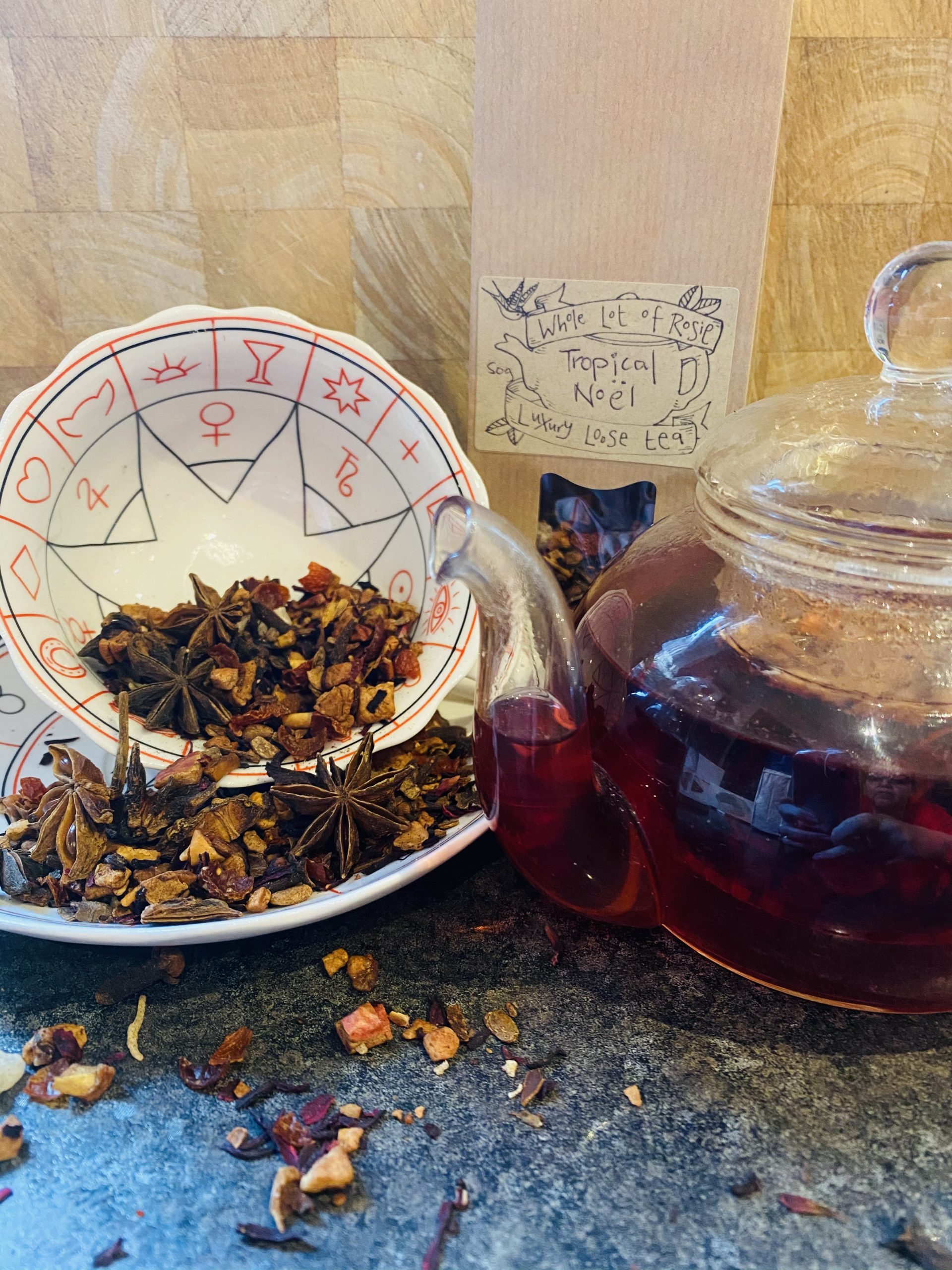 Tropical Noël Christmas Tea is a gorgeous ruby red seasonal fruit tea, with coconut, pineapple and Christmas spices including Star Anise.